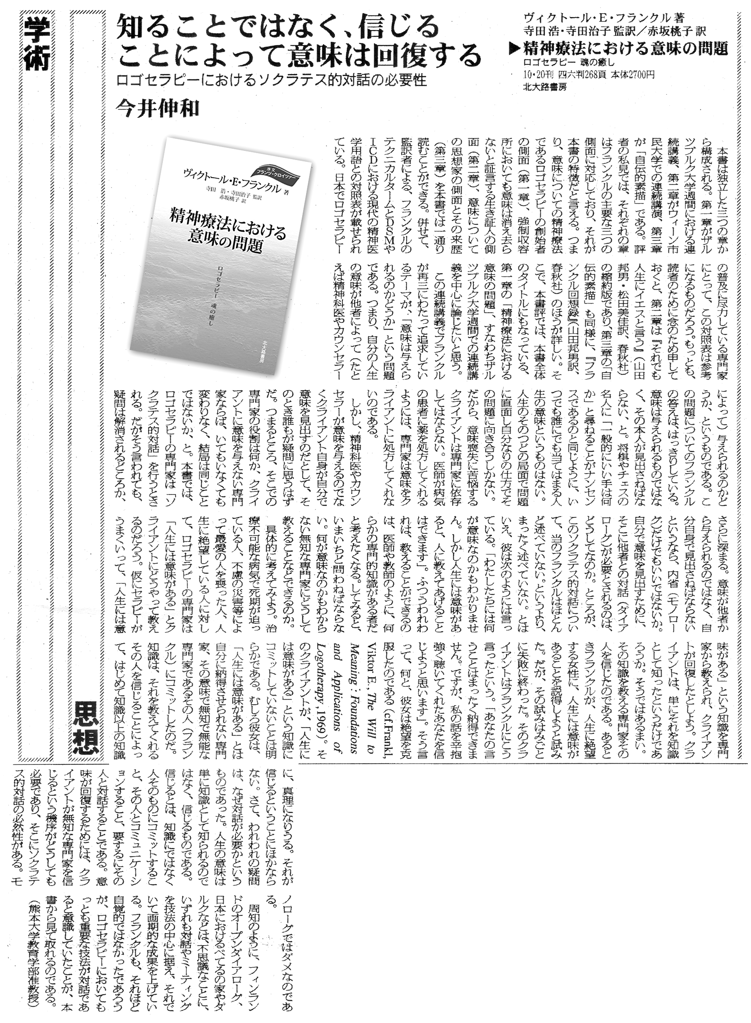 ■図書新聞 第3288号にて、当クリニックの寺田 浩先生、寺田 治子先生が監訳された「精神療法における意味の問題 : ロゴセラピー 魂の癒し」が紹介されました。