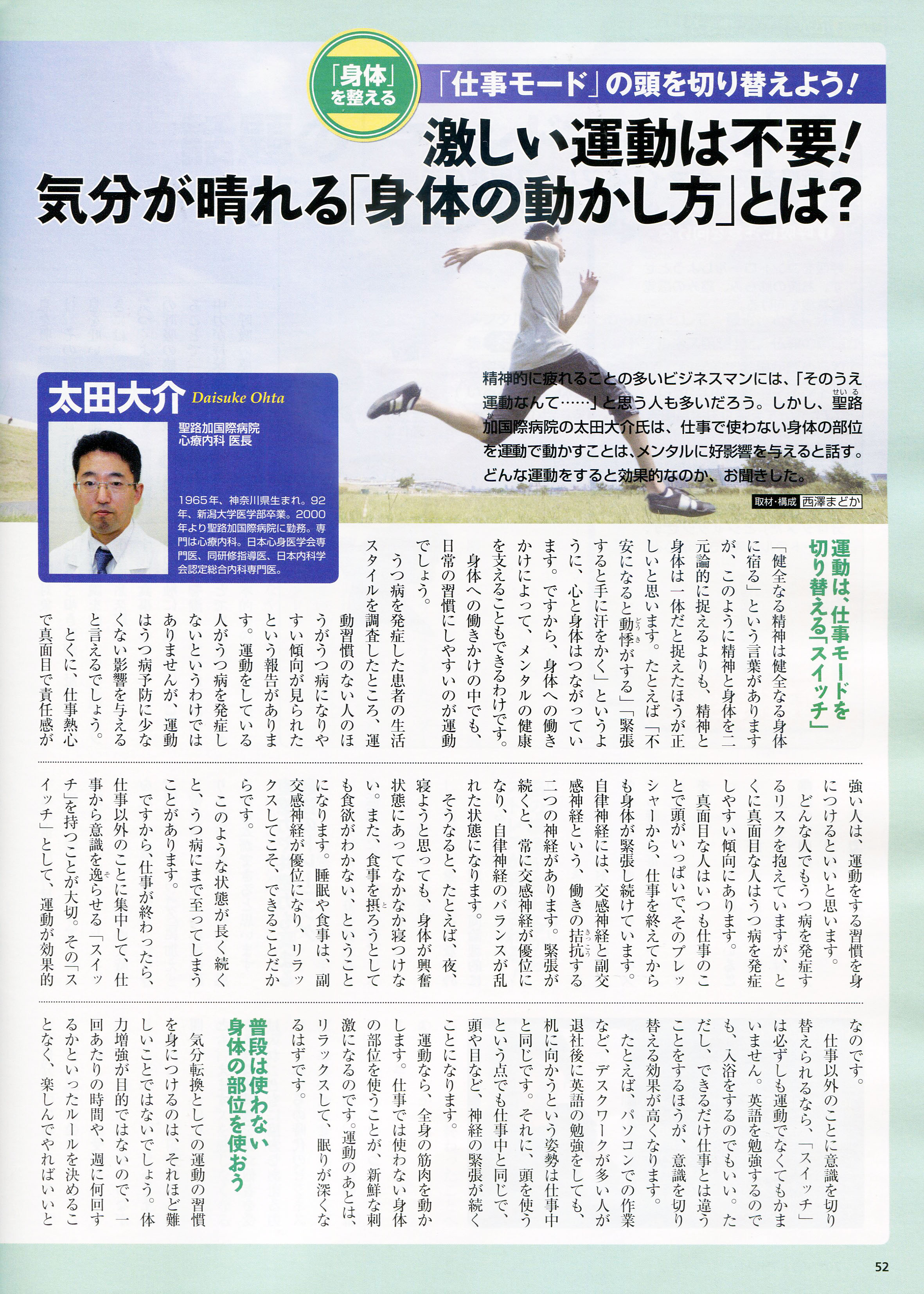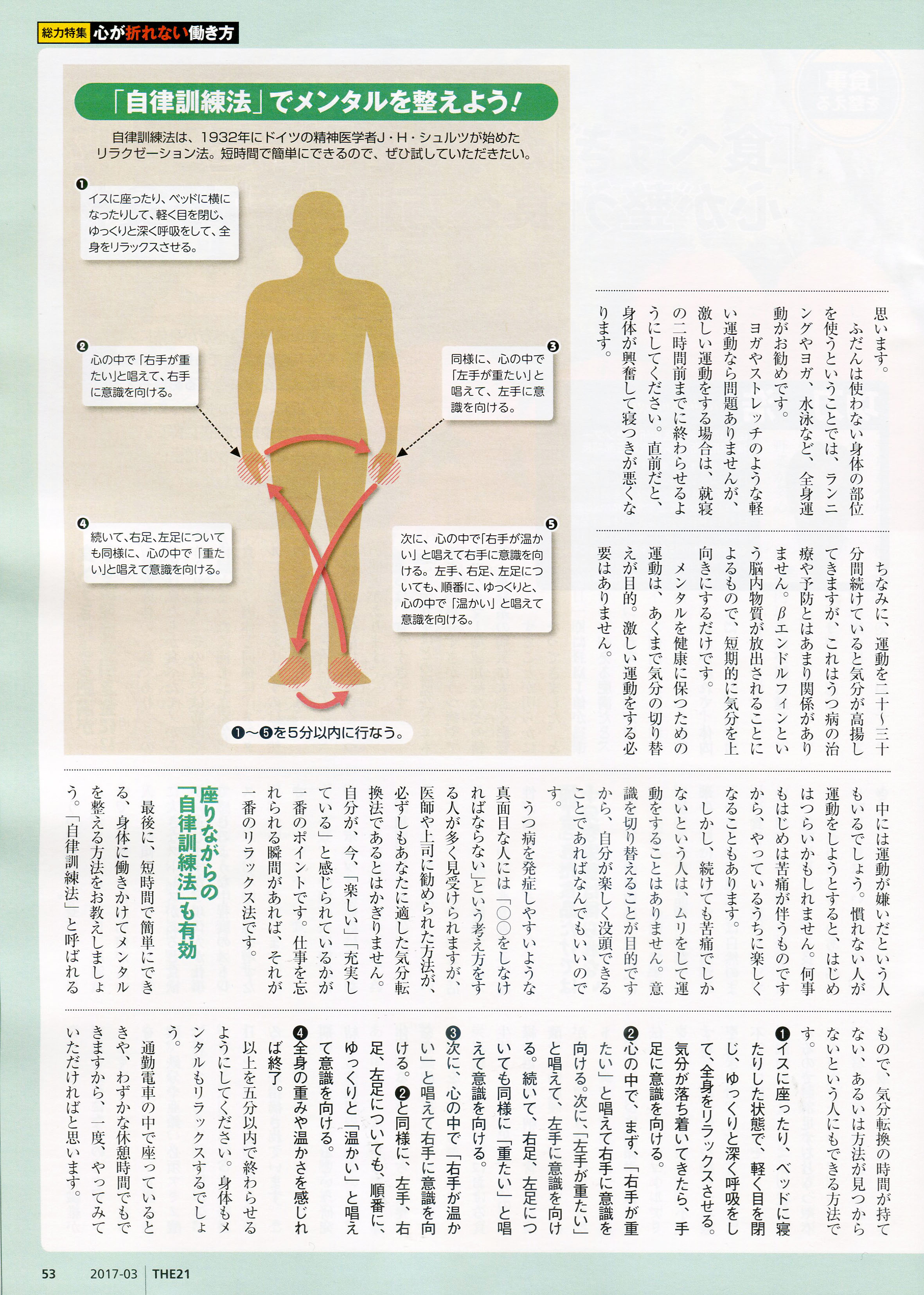 ■THE 21 2017年3月号にて、当クリニックの太田 大介先生の取材記事が「総力特集 心が折れない働き方 第2部 心とカラダを整える生活習慣」にて“「身体」を整える 激しい運動は不要! 気分が晴れる「身体の動かし方」とは?”をテーマに掲載されました。